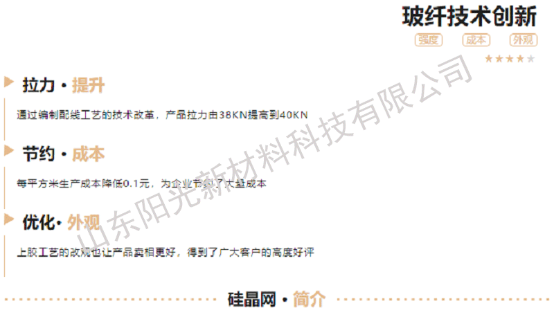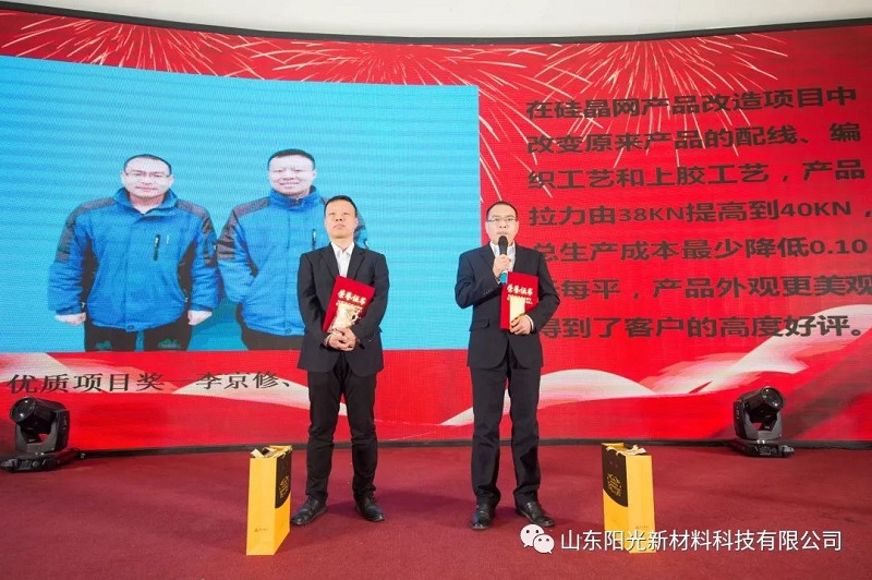 山東陽光新材料科技有限公司技術(shù)人員李京修、徐晉在硅晶網(wǎng)產(chǎn)品改造項(xiàng)目中獲得優(yōu)質(zhì)項(xiàng)目獎(jiǎng),通過改替產(chǎn)品的配線、調(diào)整編制工藝、優(yōu)化上膠方式等途徑,使產(chǎn)品在拉力上由原來的38KN提高到40KN,不僅提高了硅晶網(wǎng)的拉力強(qiáng)度,還降低了生產(chǎn)成本,同時(shí),經(jīng)過調(diào)整的經(jīng)編工藝及上膠流程使得產(chǎn)品更美觀,獲得的廣大客戶的一致好評(píng)。